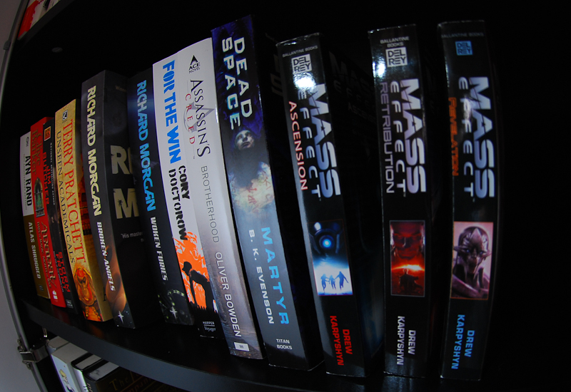 Nu är det här bara en bild av den mest nyinköpta hyllraden böcker. Tematiskt är det väl mestadels spelrelaterade böcker, bortsett från Pratchett och Richard Morgan. Det skulle stått en “Glasshouse” av Charles Stross också, men den var en katt snäll nog att slå ner i ett vattenfyllt badkar.